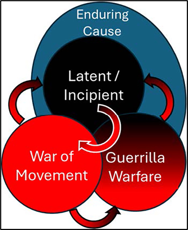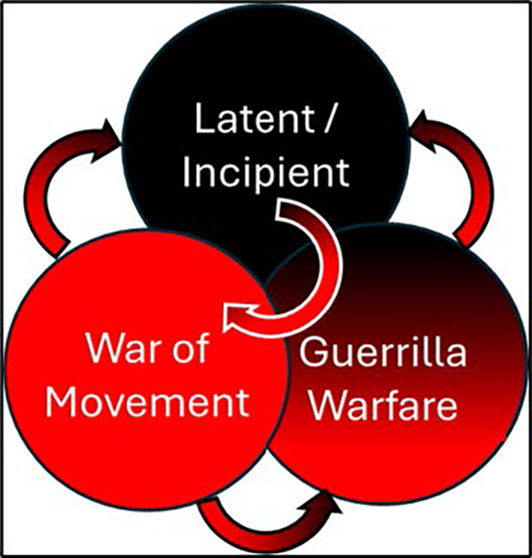 An insurgency is a protracted struggle designed to overthrow an existing power, which is measured in years and decades rather than months. The longer the struggle, the better it is generally for an insurgency as it takes root within the populace. Mao Zedong’s establishment of the People’s Republic of China in 1949, for example, was preceded by years of guerrilla warfare against Chiang Kai-shek’s Nationalists and Japanese invaders. Mao’s theory of insurgency allows for an insurgency to move back and forth between phases – latent and incipient organization, guerrilla warfare, and conventional “war of movement”– as conditions require to ensure survival. Additionally, there can be synchronized efforts between conventional and insurgent forces , or hybrid warfare, based on the need as was the case of North Vietnamese Army regulars and Viet Cong insurgents operating in different areas in South Vietnam against U.S. and South Vietnamese forces. Throughout this protracted struggle and its shifting phases, an insurgency needs a galvanizing cause that helps drive a wedge between the people and the established government.