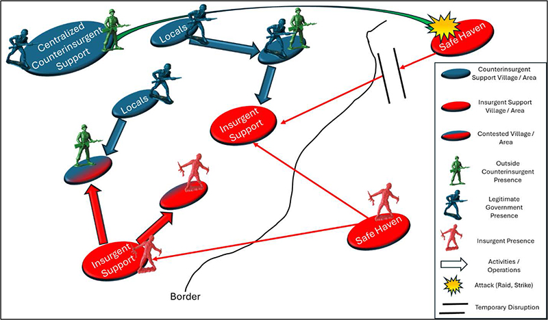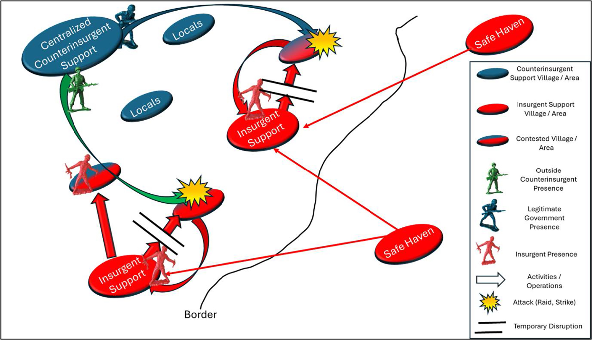 This simple, yet profound imagery, known as the Paradoxical Trinity, has influenced and informed the Western way of warfare for almost 200 years. It reflects the pressure that exists within a nation that goes to war with another nation. Though all three elements exist in an insurgency conflict, the protracted struggle is for influence over the people within a nation. The conflict is within itself. Dueling paradoxical trinities fight over the population for support. One trinity is the legitimate government with its military and the people that support both. The other is the insurgent’s shadow government, dutiful guerrillas, and the people it seeks to win over. The more the people support an insurgency, the more legitimate it becomes until it usurps the authority of the counterinsurgent government.